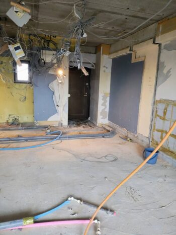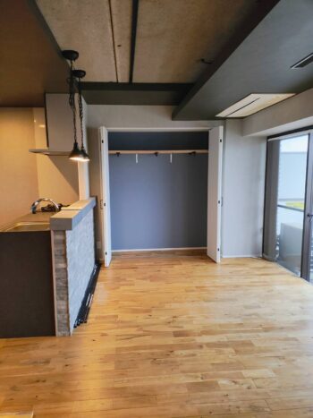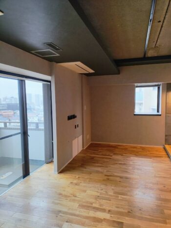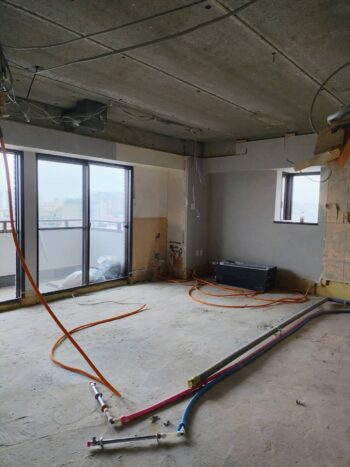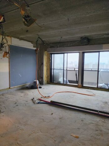 今回の物件はフルリノベーションなので、間仕切壁、床、天井、水回りなどすべて撤去し、スケルトン状態にしました。